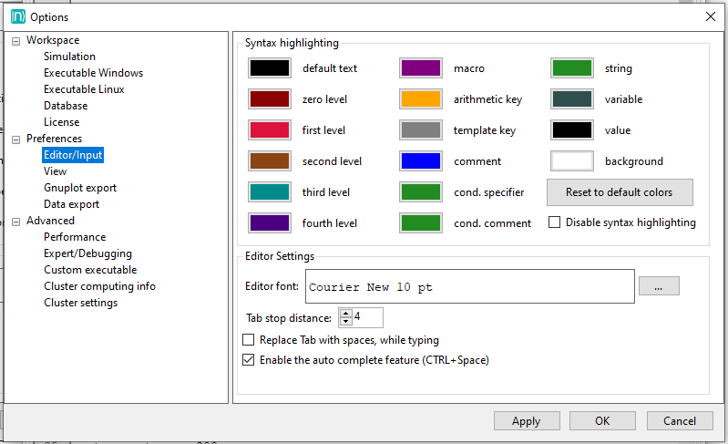 In the editor settings, you can customize the sytax highlighting or font of the input tab. “Tab stop distance” defines the number of spaces a single Tab will be replaced with. Automatic replacement can be switched on by setting the check box accordingly. Additionally, Tab replacement can be triggered via the “Edit” main menu function for a specific input file.