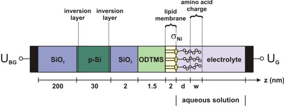 This oxide layer is passivated by an ODTMS (octadecyltrimethoxysilane) monolayer which is required for the bio-functionalization of the semiconductor device. We take a 1.5 nm thick oxide-like ODTMS layer (232 nm - 233.5 nm) and use a static dielectric constant of epsilon = 1.5. Due to the passivation by ODTMS, we assume that no interface charges are present at the native oxide surface. The ODTMS layer is surface-functionalized with a lipid membrane that allows the specific binding of molecules. This lipid monolayer (2 nm) consists of DOGS-NTA (1,2-dioleoyl-sn-glycero-3-{[N(5-amino-1-carboxypentyl)iminodiacetic acid]succinyl}) incorporated into two matrix lipids (DMPC (1,2-dimyristoyl-sn-glycero-3-phosphocholine) and cholesterol). The lipid membrane is treated as an insulator using the same material parameters as for ODTMS. Thus, no charge carriers are assumed to be present within this layer. As the lipid layer is very dense, no electrolyte is considered within the lipid region. The functionalized surface exposes NTA headgroups that carry two negative charges to the electrolyte solution. They have the ability to form a chelate complex with nickel ions if the latter are present in the solution. Upon loading with nickel, the charge of the headgroup changes by +1e and is then considered to be -1e. This results in a negative sheet density sigmaNi at the lipid/electrolyte interface. The surface density of the DOGS-NTA lipids is considered to be 5 % (fNTA = 0.05). The approximated headgroup area, i.e. the average area per functional DOGS-NTA is assumed to be ANTA = 0.65 nm2. Consequently, the density of the headgroups is sNTA = fNTA / ANTA = 7.7 * 1012 cm-2, so that the resulting charge density sigmaNi is given by sigmaNi = - e * sNTA, where we have assumed that each headgroup carries one negative charge upon exposure to Ni.