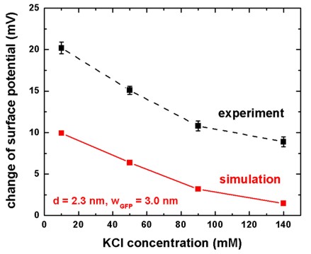 Influence of the ionic strength on the sensitivityGreen fluorescent proteinAs a second protein, we consider the binding of the so-called green fluorescent protein (GFP) to the lipid membrane. GFP is also histidine-tagged to the NTA headgroups of the membrane. The size of GFP is larger (length of 4-5 nm) compared to his-tagged aspartic acids. We assume a charge distribution of width w = 3.0 nm that is connected with a neutral tag of width d = 2.3 nm to the NTA headgroups. At pH = 7.5, GFP carries eight negative charges that we assume to be homogeneously distributed over the protein region w. Here, we use the same sensor structure as in Fig. 1 but detect another protein. We consider the specific binding of the green fluorescent protein (GFP) to the lipid membrane and calculate the change of the surface potential as a function of the salt concentration (10, 50, 90 or 140 mM KCl) in the electrolyte. At pH = 7.5, GFP carries a net negative charge of -8e as can be derived from the primary structure if one calculates the charge of the sidechains for the used buffer solution. Consequently, the integrated charge density of GFP is given by sigmaGFP = - 8 e sNTA. We assume for simplicity that this charge is distributed evenly over a distance of wGFP = 3 nm which is close to the length of the GFP (4-5 nm). Based on the previous section, the length of the neutral part of the tag has been taken to be d = 2.3 nm. Here, this length has been assumed to be the same for all KCl concentrations.