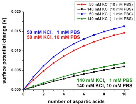 the charge density in the silicon channel are greater in the case of 50 mM KCl. The right figure shows the different sensitivity due to the PBS buffer concentrations. Using a 1 mM PBS buffer reduces the ionic strength and thus the screening of the aspartic acid charges with respect to the 10 mM PBS buffer.