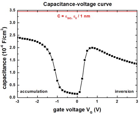 The following figure shows the C-V curve again for the 3 nm SiO2