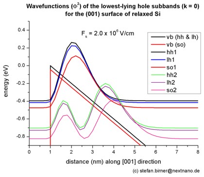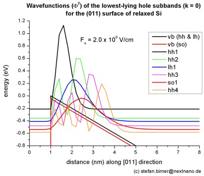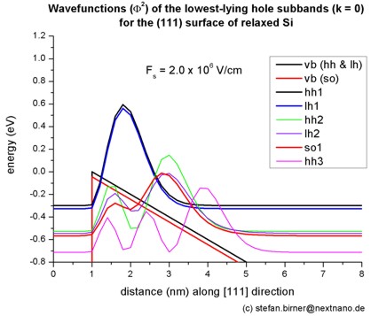 light hole band edges are degenerate) and the six lowest hole wave functions of a Si