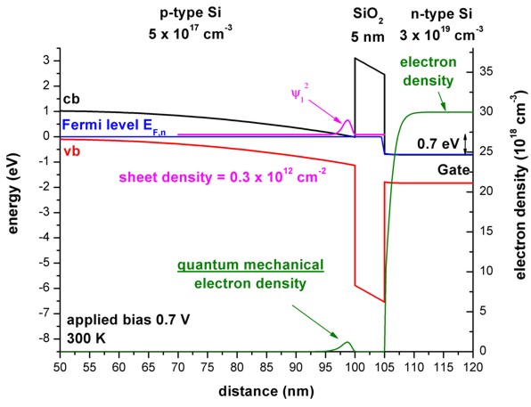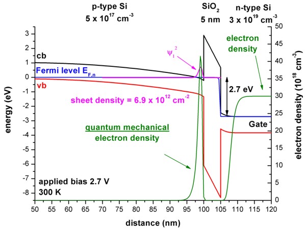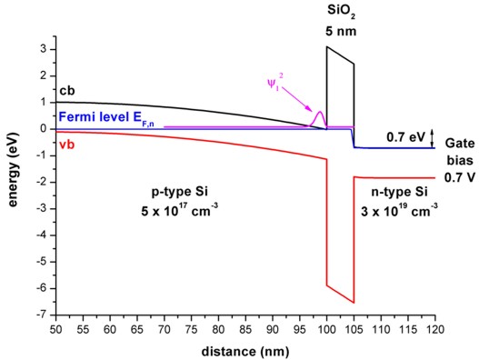 (Inside the SiO2 barrier the Fermi level has a step-like feature.