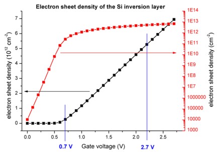 - Electron sheet density in the inversion channel as a function of