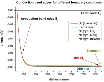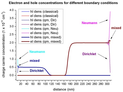 • The following figure shows the electron and hole concentrations for the classical and quantum mechanical calculations. For the QM calculations, different boundary conditions were used.