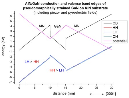 The following figure shows the conduction and valence band edge alignment in AlN/GaN structures (unstrained). In AlN, the light hole (LH) is the highest valence band whereas in GaN, this is the heavy hole (HH). We assumed a valence band offset of VBO = 0.5 eV, the conduction band offset is much larger (CBO = 2.3 eV). All material parameters are based on the paper