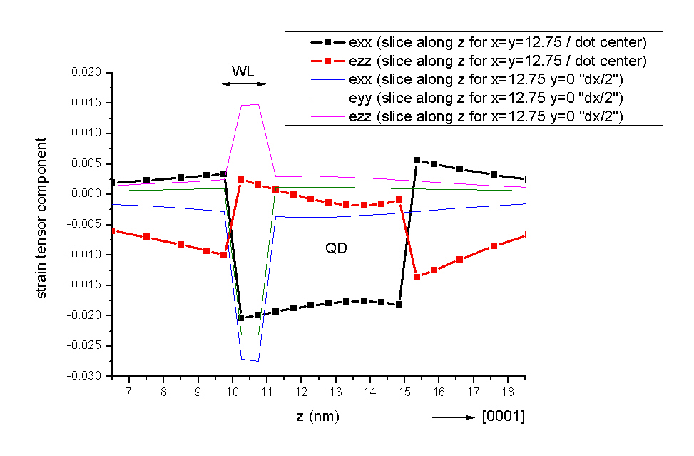 The simulated hexagonal GaN quantum dot (height = 4 nm) is embedded in an AlN matrix. The wetting layer is 1 nm thick and consists of GaN.