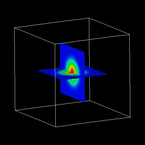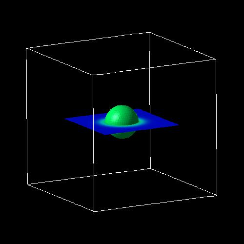 The following figures show an isosurface (left figure) and contour plots of 2D slices (right figure) through the ground state electron wave function (psi²) of the 7 nm spherical GaAs nanocrystal.