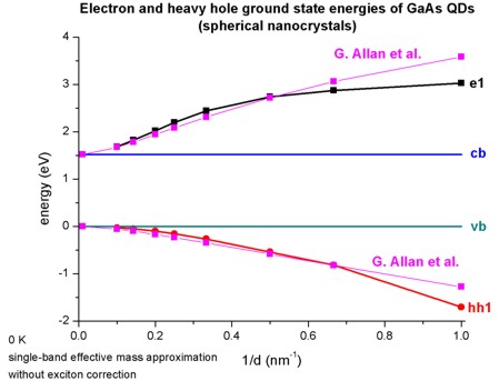 The following figure shows the energies of the electron ground state and the heavy hole ground state in spherical GaAs nanocrystals as a function of the inverse of the nanocrystal diameter d (d = 1 nm / 1.5 nm / 3 nm / 4 nm / 5 nm / 7 nm / 10 nm).