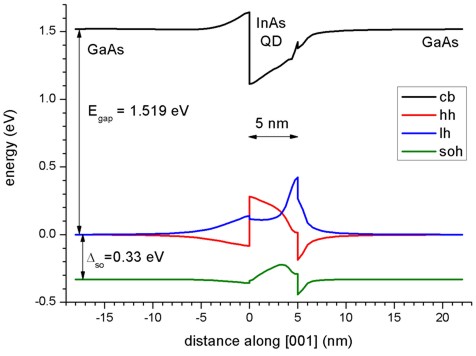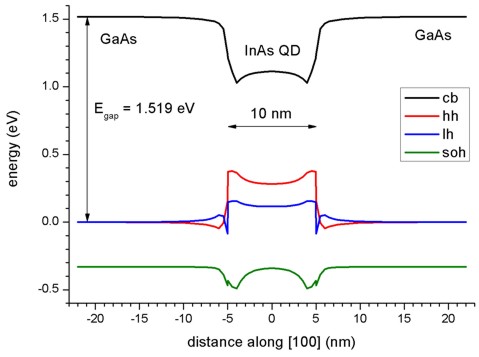 The following figures shows the conduction and valence band edges (heavy hole, light hole and split-off hole) for a 10 nm pyramidal shaped QD along two different line scans.